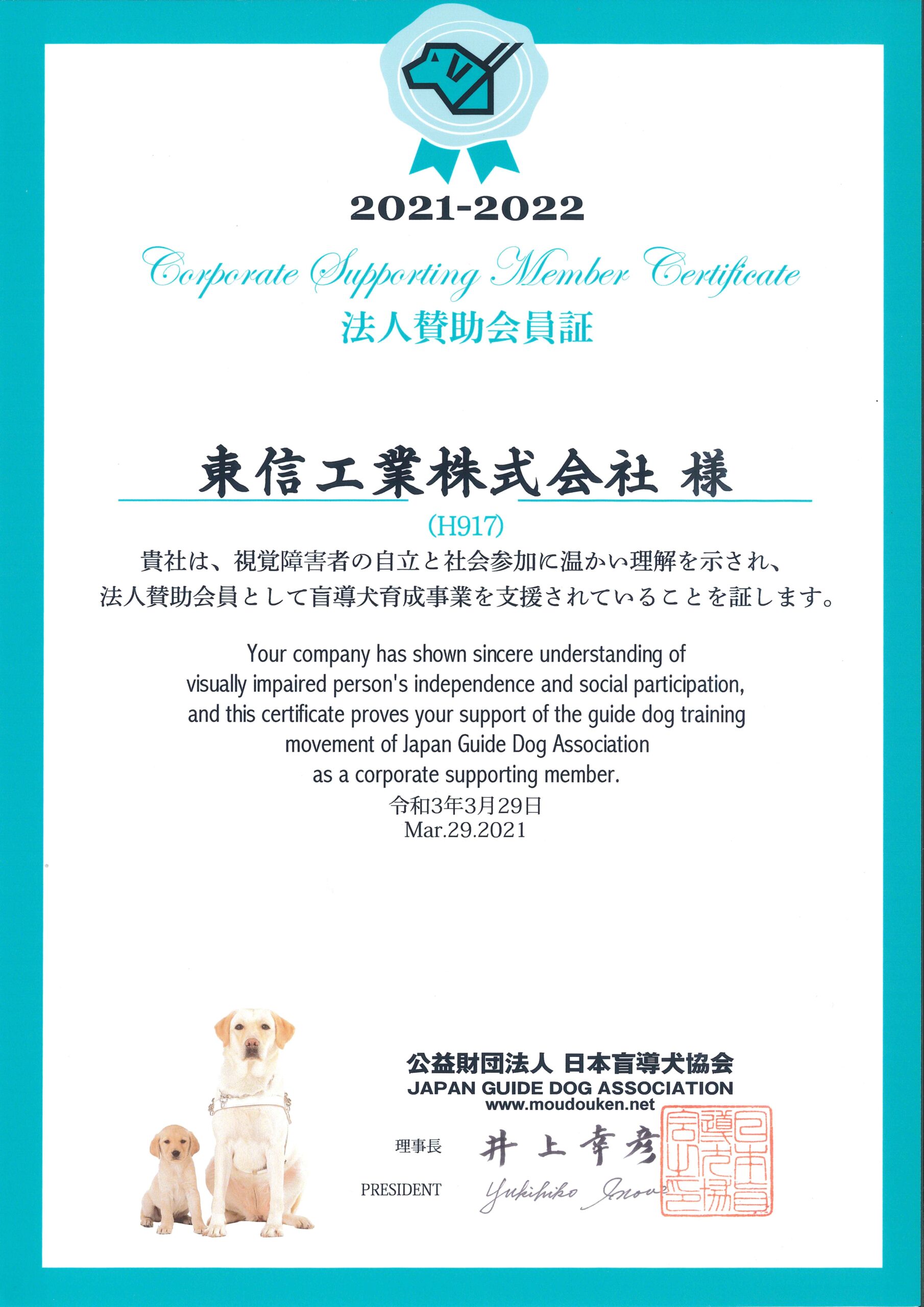 (公財)日本盲導犬協会の法人賛助会員として応援しています。2021-2022