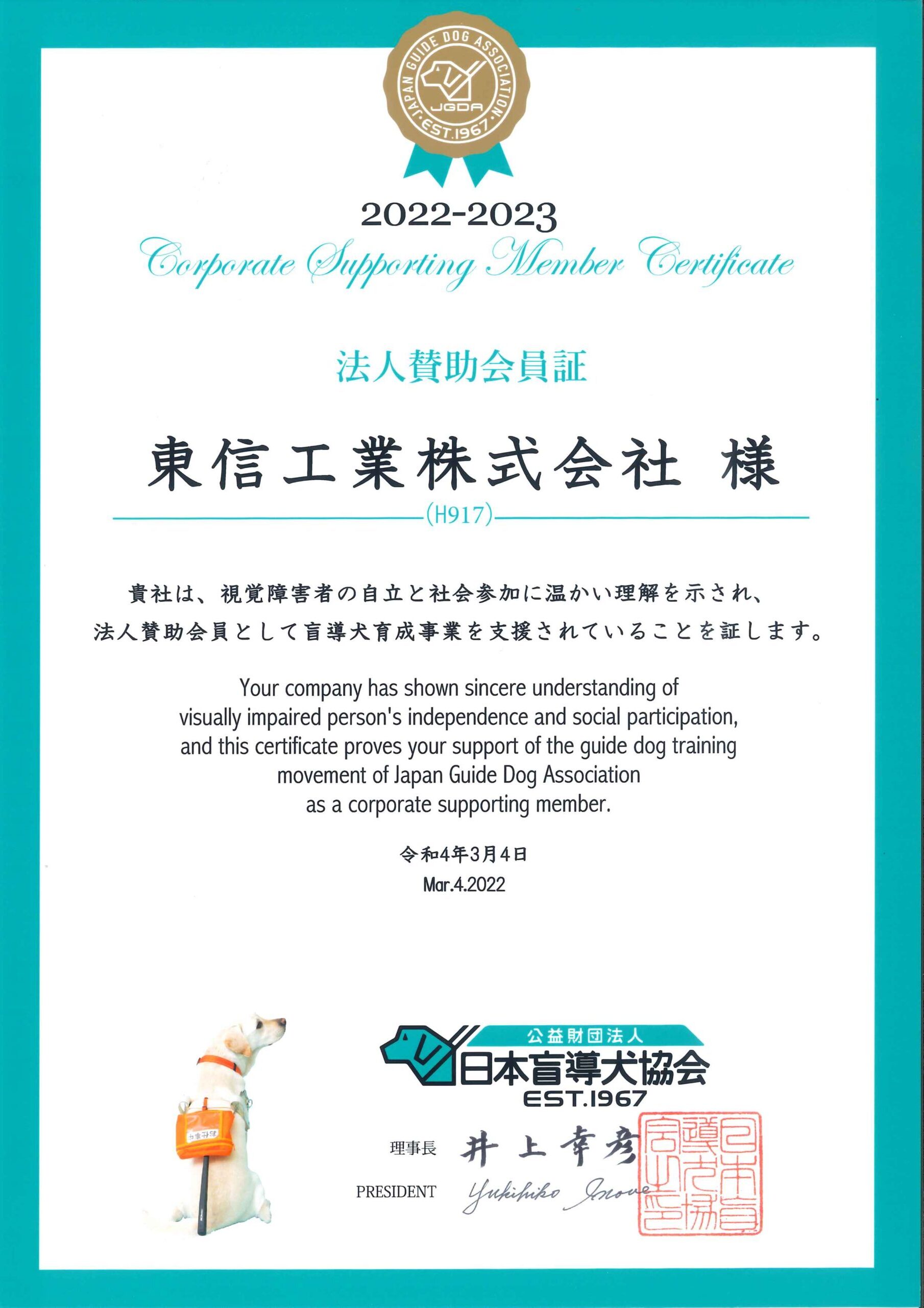 (公財)日本盲導犬協会の法人賛助会員として応援しています。2022-2023