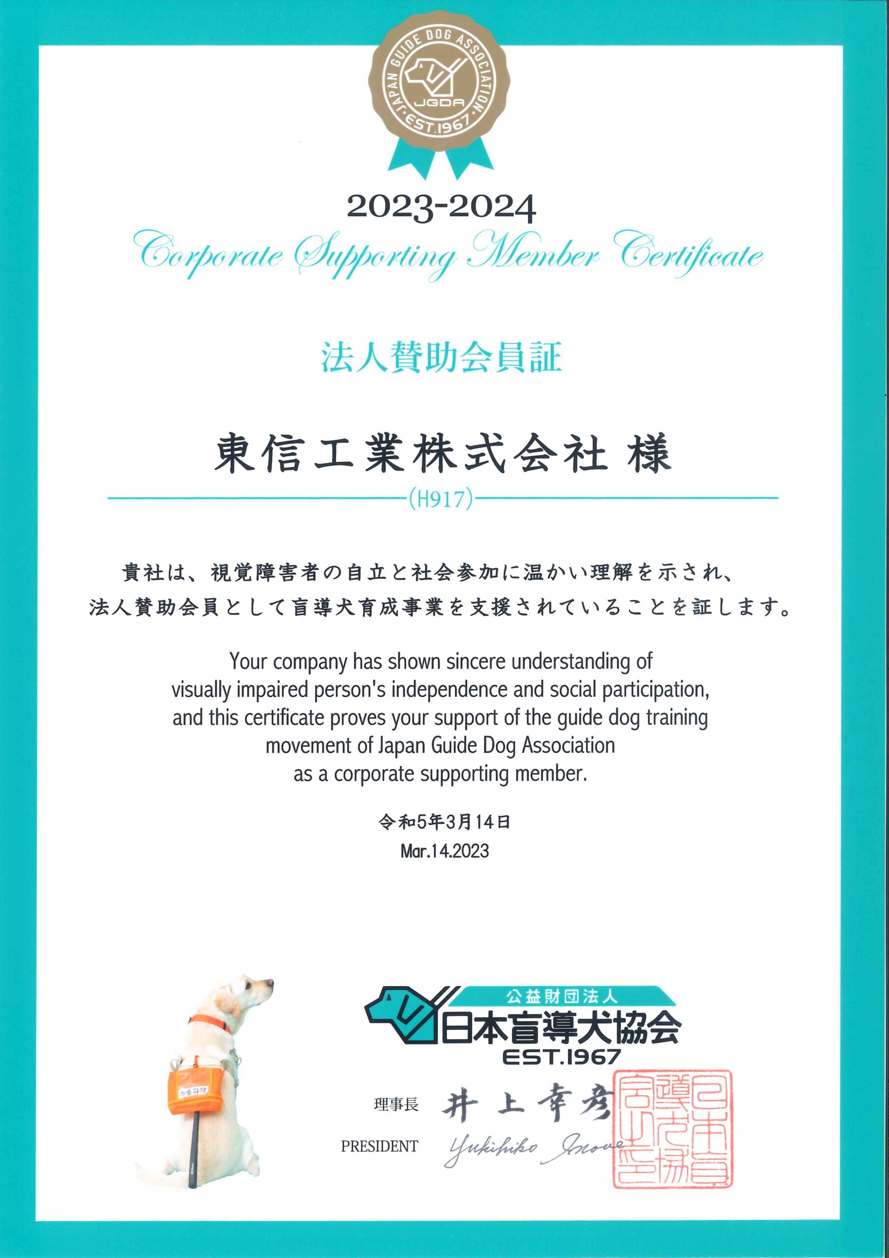 (公財)日本盲導犬協会の法人賛助会員として応援しています。2023-2024