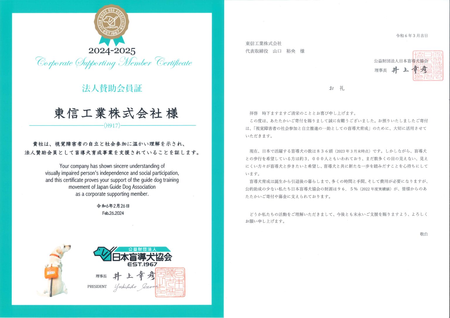 (公財)日本盲導犬協会の法人賛助会員として応援しています。2024-2025