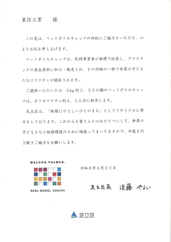 足立区から感謝状をいただきました